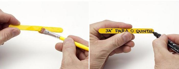 De que vamos precisar? Palitos de sorvete, tinta plástica, lata de molho de tomate, tesoura de ponta redonda, pincel, papel, vinil, adesivo e caneta permanente.
